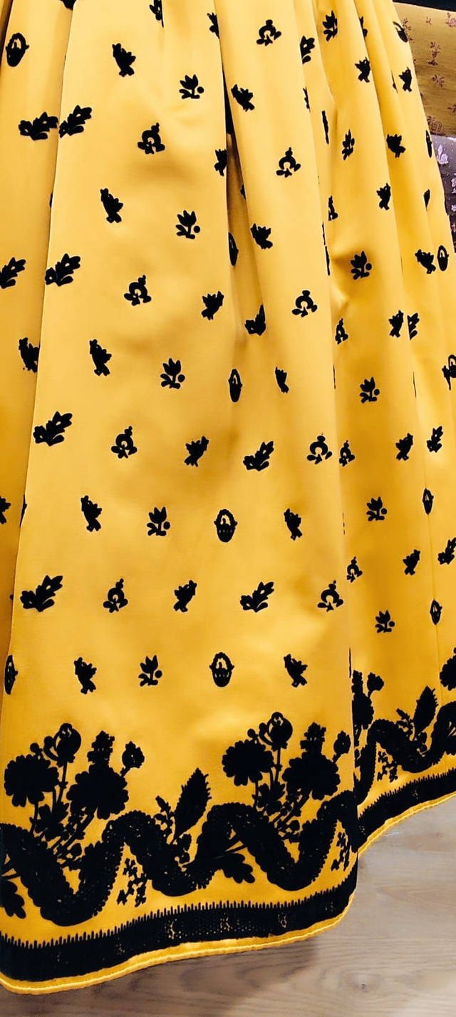 Basquiña confeccionada de terciopelo labrado raso brillo en color oro.
