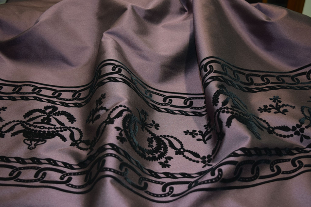 Guardapiés de cintas sobre un tafetán de fondo color berenjena con el dibujo en terciopelo labrado negro.