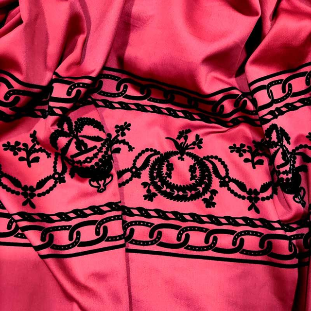 Corte de guardapiés de raso brillo con adorno de cintas en terciopelo flocado. 4 caídas de 110x 100cm. (largo x ancho).